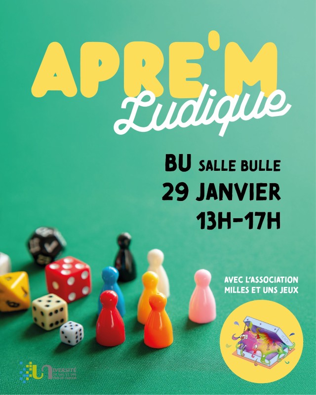 Venez jouer à la BU ! Après les examens, la bibliothèque et l'association étudiante Les Mille Et Un Jeux vous proposent un moment de détente et de convivialité autour de jeux de société.